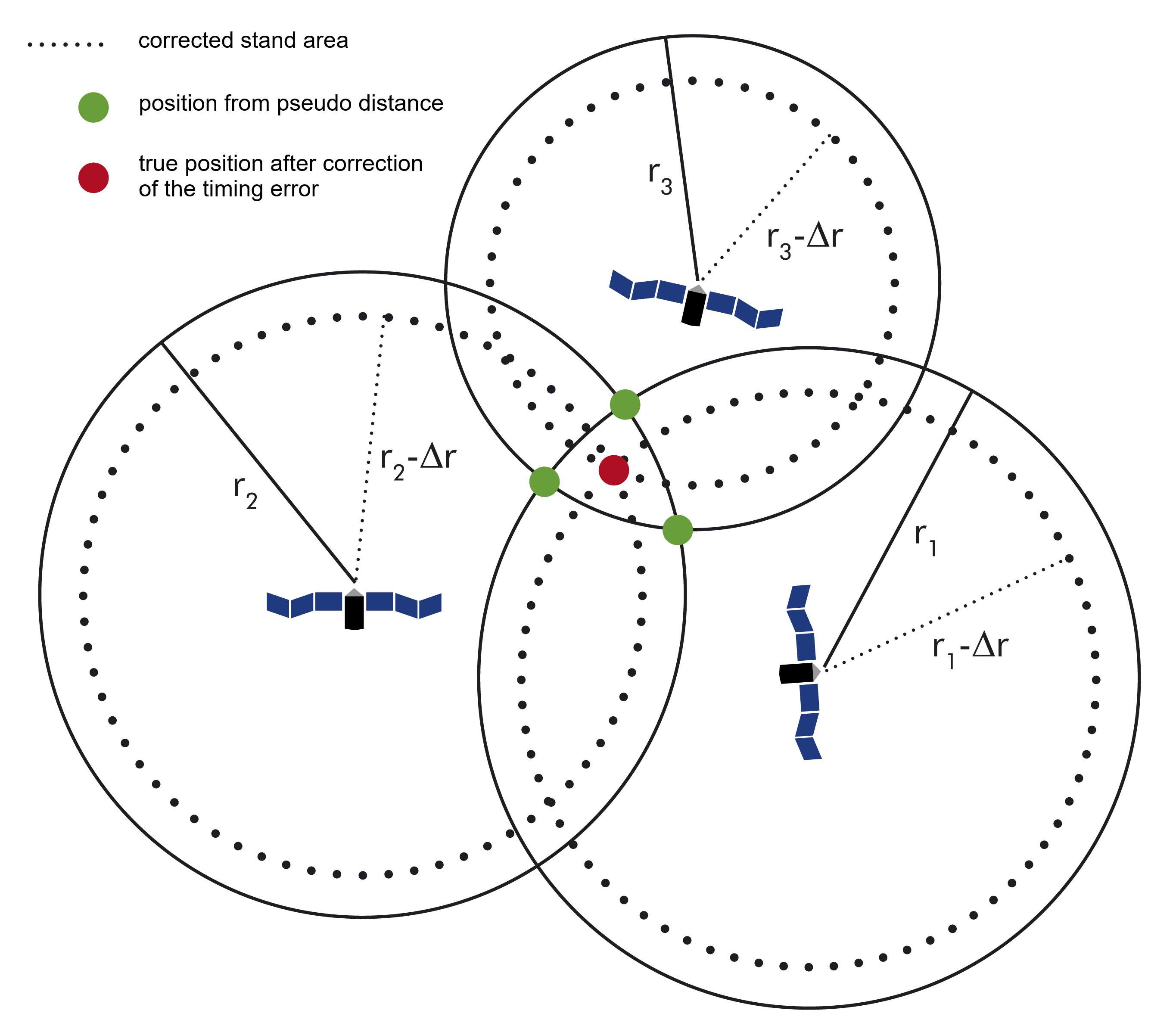 Therefore, the resulting distances are all afflicted with the same error Δr. This error leads to a rather inaccurate global positioning as shown in the illustration on the right.