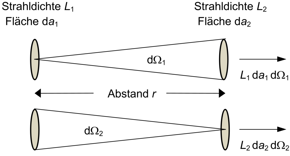 Die Strahldichte kennzeichnet die Strahlungsleistung, die von der Fläche in diesen Raumwinkel ausgestrahlt wird: