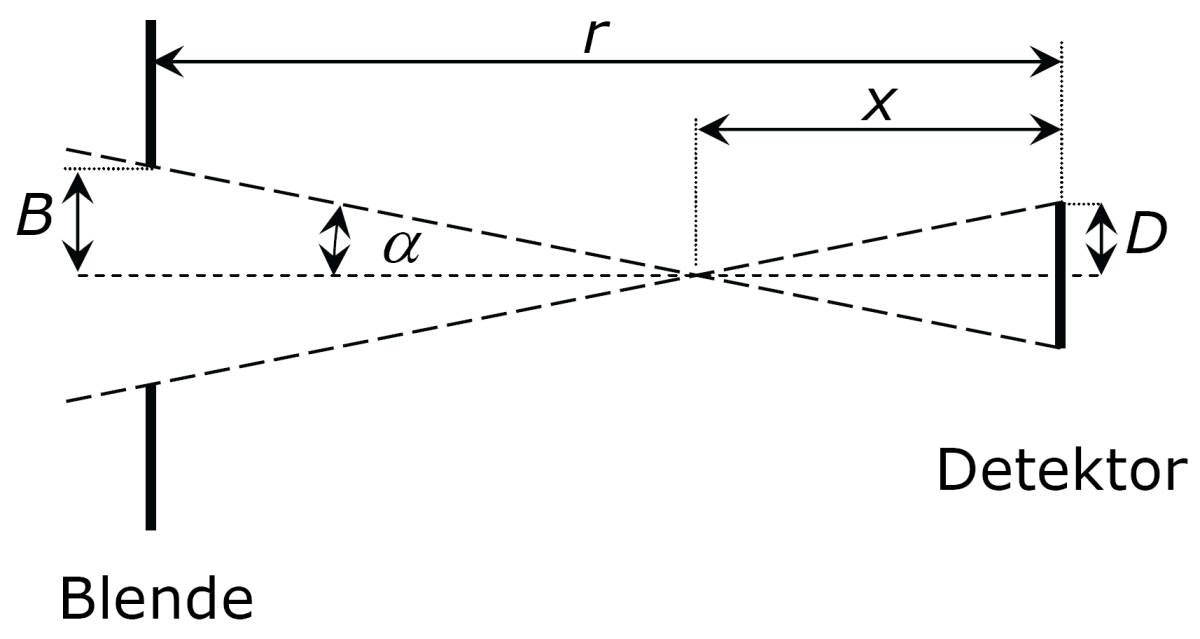 Das Gesichtsfeld eines Detektors mit BlendeDetektor und Blende sind im Abstand r angeordnet. Der Radius des Detektors ist D, der Radius der Blende ist B. ist der größtmögliche halbe Gesichtsfeldwinkel.