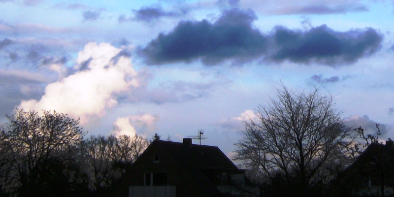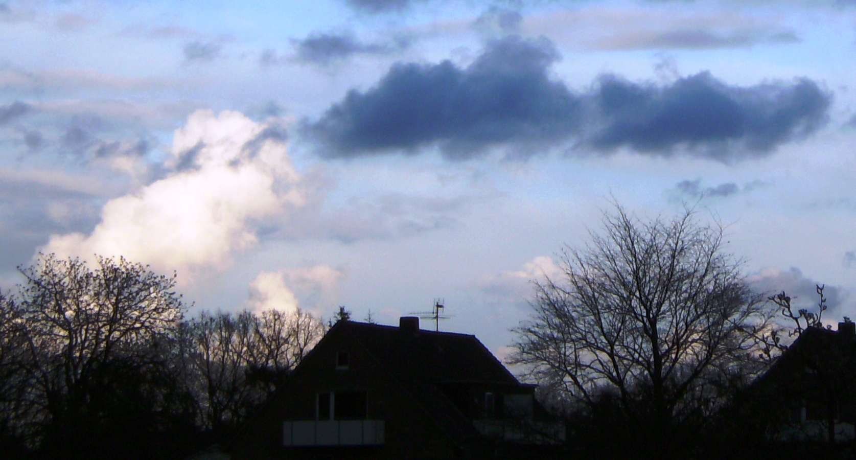 Ook donkere cumulonimbuswolken kunnen cosinusverspreiders zijn: hun druppeldichtheid is zo hoog dat veel licht door absorptie verloren gaat van de bestraalde bovenkant naar de onderkant. Op de foto zijn ook witte cumuluswolken te zien, die cosinusverspreiders zijn. Hoger gelegen, gedeeltelijk transparante wolken zijn door het avondzonlicht roodachtig gekleurd en vertonen geen goede cosinuskenmerken.