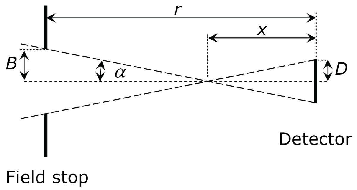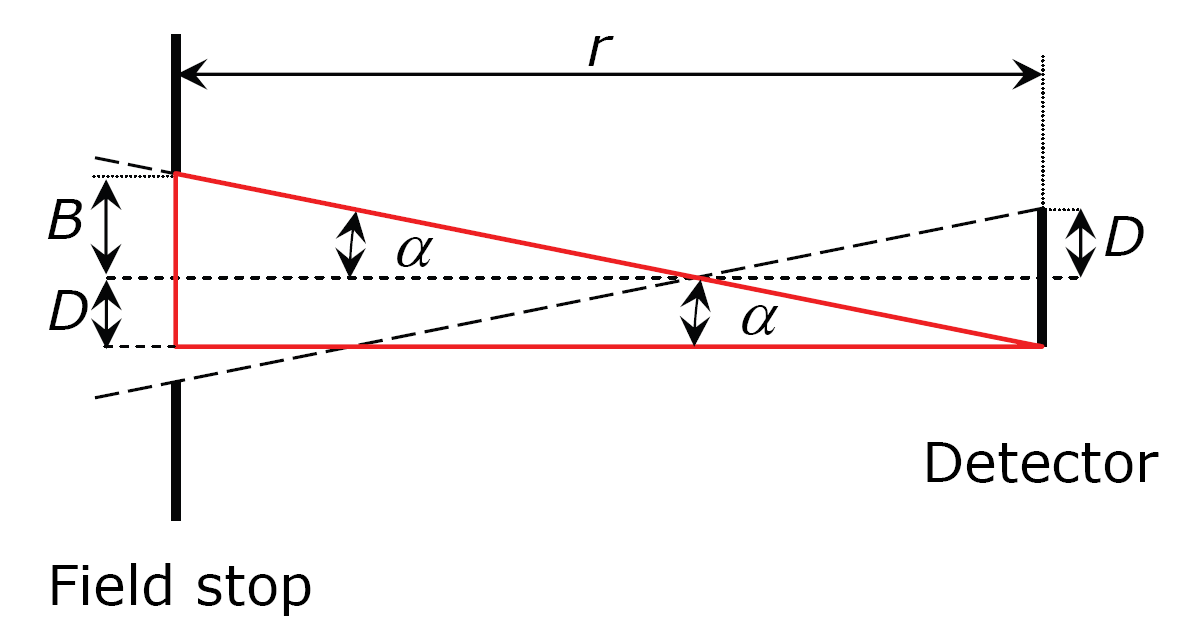 The detector and aperture are arranged at a distance r. The radius of the detector is D, the radius of the aperture is B. is the maximum possible half-field of view angle.