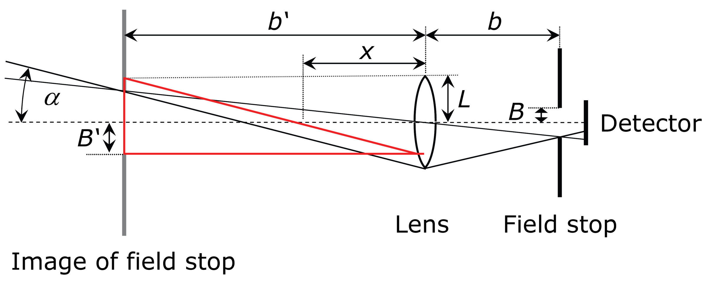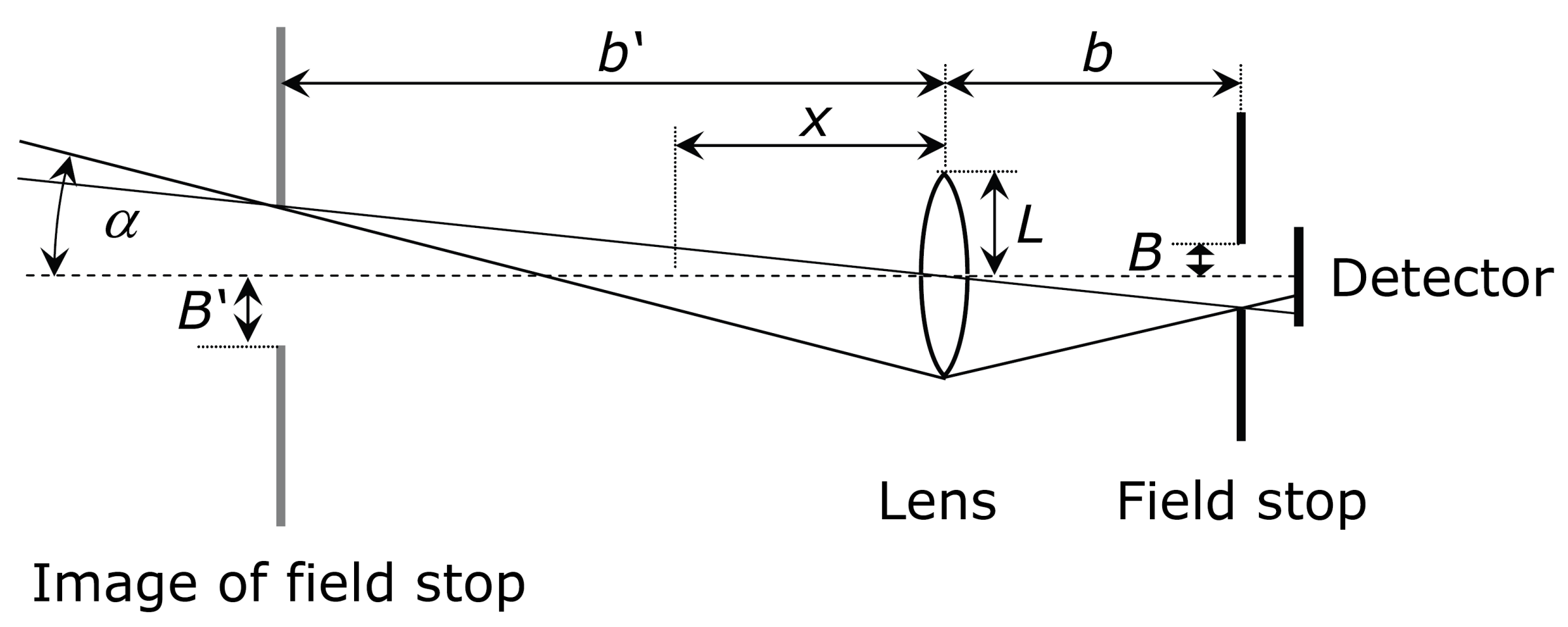 The maximum reception angle is determined by the lens (with radius L and focal length f) and the aperture at a distance b. The sensitive area of the detector behind the aperture should be large enough so that it does not limit the beam path. The largest possible half-field-of-view angle results from the image of the aperture B' at a distance b' from the lens.