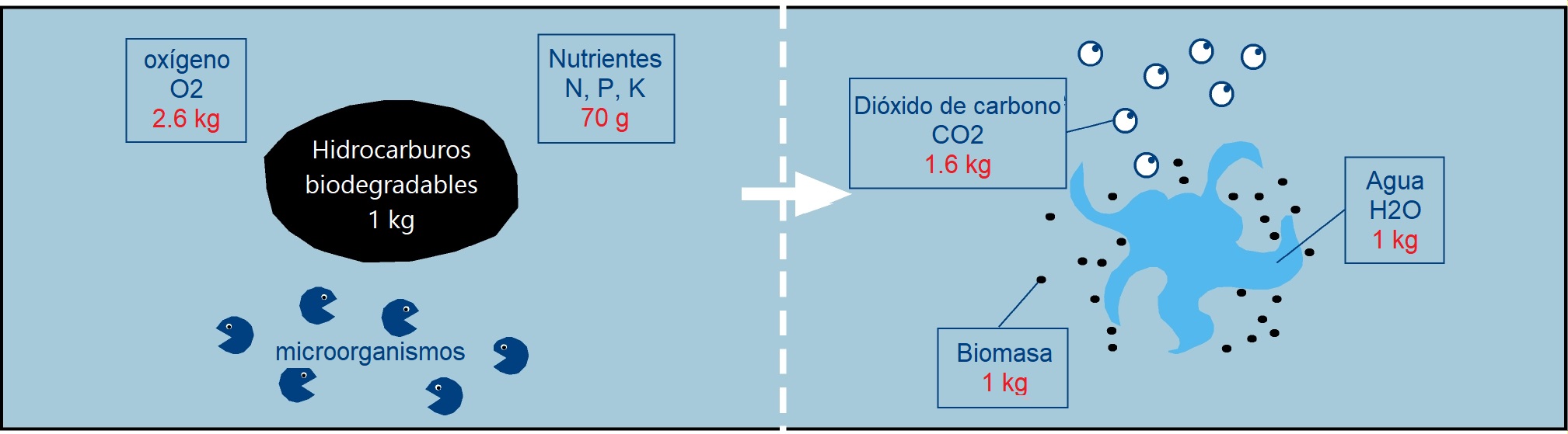 Debido a que los microorganismos viven en el agua, de la que obtienen oxígeno y nutrientes esenciales, la biodegradación sólo puede tener lugar en una interfaz agua / aceite. En el mar, la creación de gotitas de petróleo, ya sea por dispersión natural o química, aumenta el área interfacial disponible para la actividad biológica y, por lo tanto, puede aumentar la degradación.