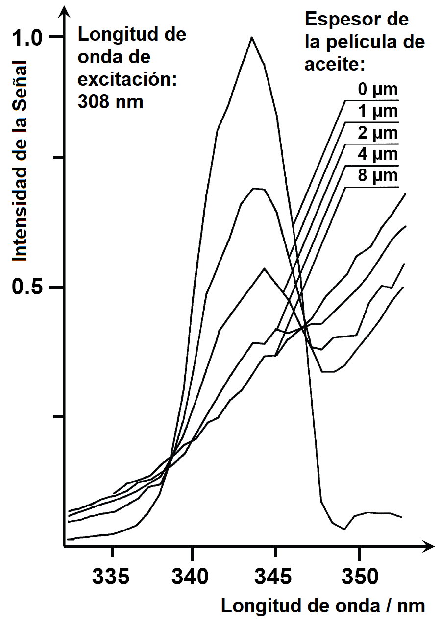 Como se muestra en el gráfico de la izquierda, la dispersión Raman de agua produce un pico estrecho característico. Medir su altura permite calcular el espesor de la película de aceite en la superficie del agua. Debido a la alta absorbancia de la radiación ultravioleta en el aceite, se pueden analizar películas con un espesor micrométrico, como se muestra en el gráfico siguiente.