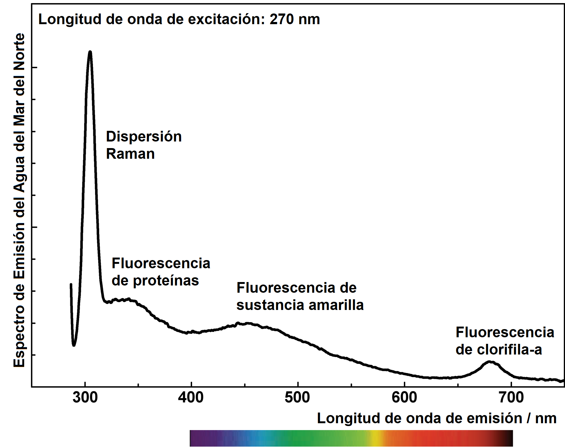 Las moléculas de agua dispersan la luz. Además de la dispersión de Rayleigh, que causa el color azul de las aguas limpias a la luz del sol, también existe otro efecto llamado dispersión Raman. El efecto Raman se caracteriza por un cambio de emisión a longitudes de onda que son más altas que la longitud de onda de la luz que ilumina. Por lo tanto, la iluminación del agua con luz láser monocromática produce un espectro de emisión que muestra un pico característico de dispersión Raman, como se muestra en el gráfico siguiente.
