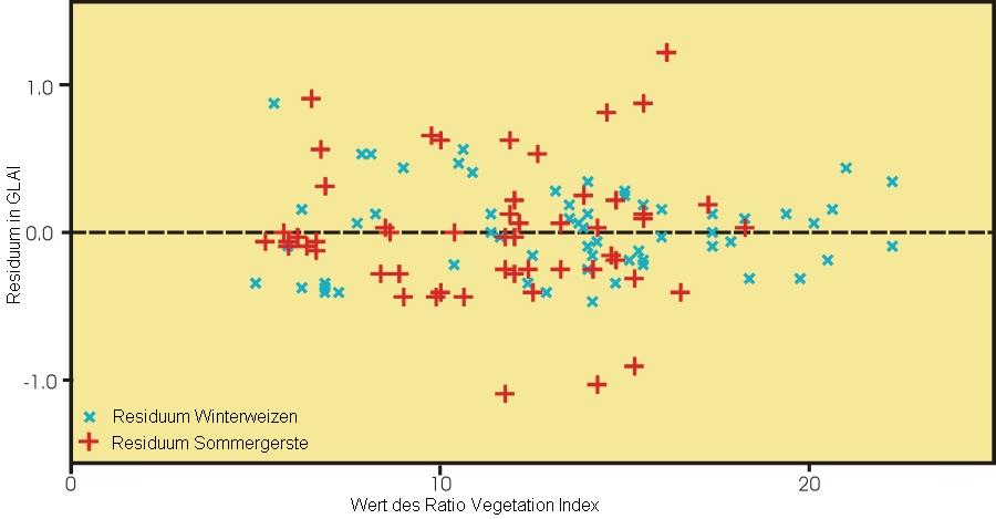 Die Residuen für die Sommergerste zeigen andererseits kein signifikantes Muster, obwohl es ein paar große Ausreißer gibt. Obwohl ein Polynom zweiter Ordnung beim Winterweizen etwas kleinere Residuen liefert, soll hier weiterhin die lineare Regression genutzt werden. Im folgenden Kapitel betrachten wir die Güte der Ausgleichsgeraden nach dem linearen Modell.